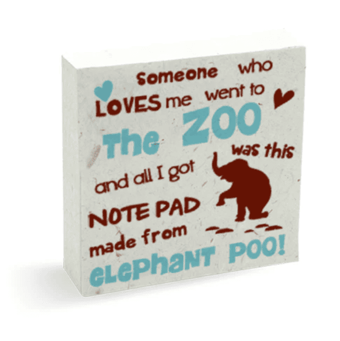 The front design reads: “Someone who loves me went to the zoo and all I got was this note pad made from elephant poo!”—making it a perfect keepsake, gag gift, or souvenir for zoo lovers, wildlife fans, and anyone who appreciates sustainable, humorous products.