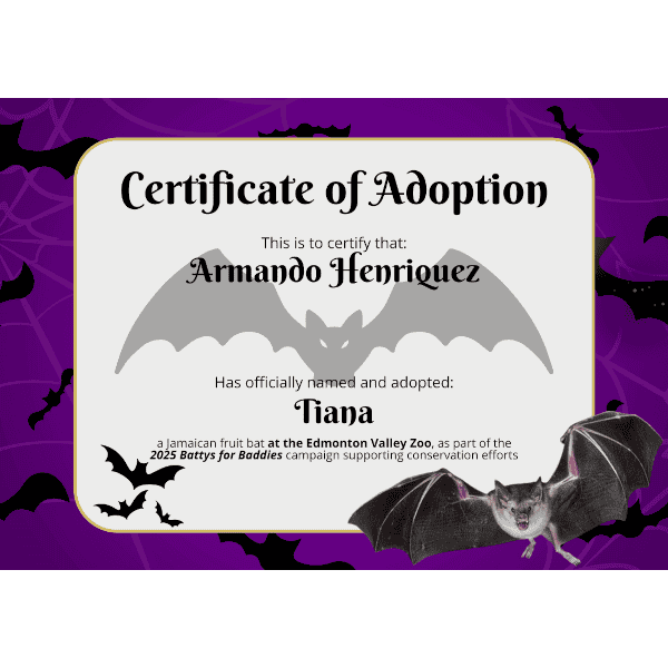 Want to symbolically name and adopt a bat in honor of your favorite “baddie”? Show your love for our spooktacular winged friends by donating $50 to the Battys for Baddies Campaign and symbolically name and adopt one of the Edmonton Valley Zoo’s Jamaican Fruit Bats! Proceeds from this year’s campaign benefit local bat conservation efforts.